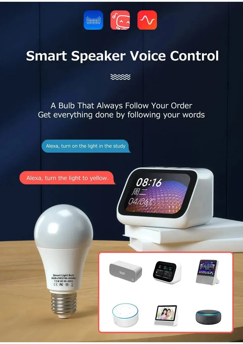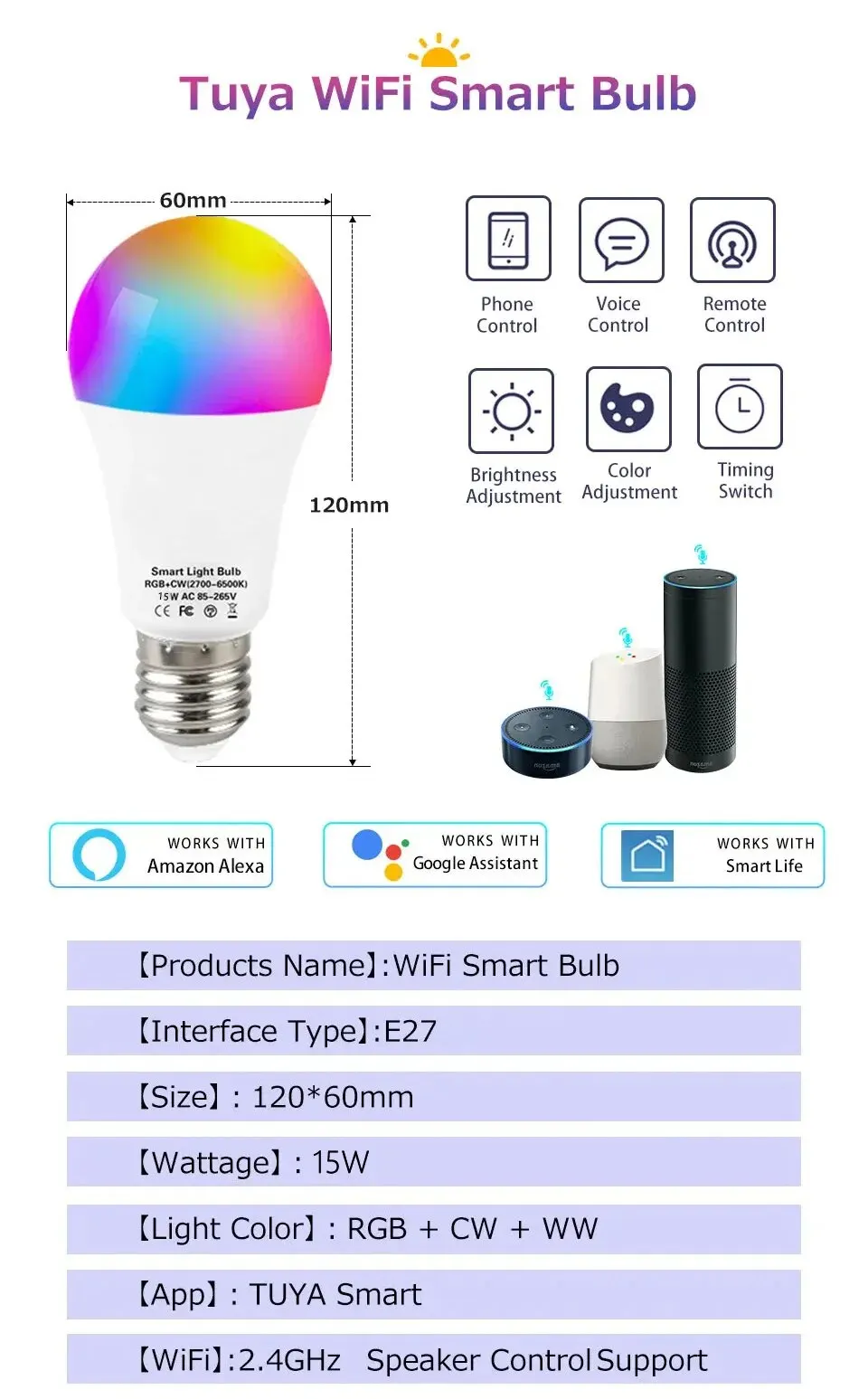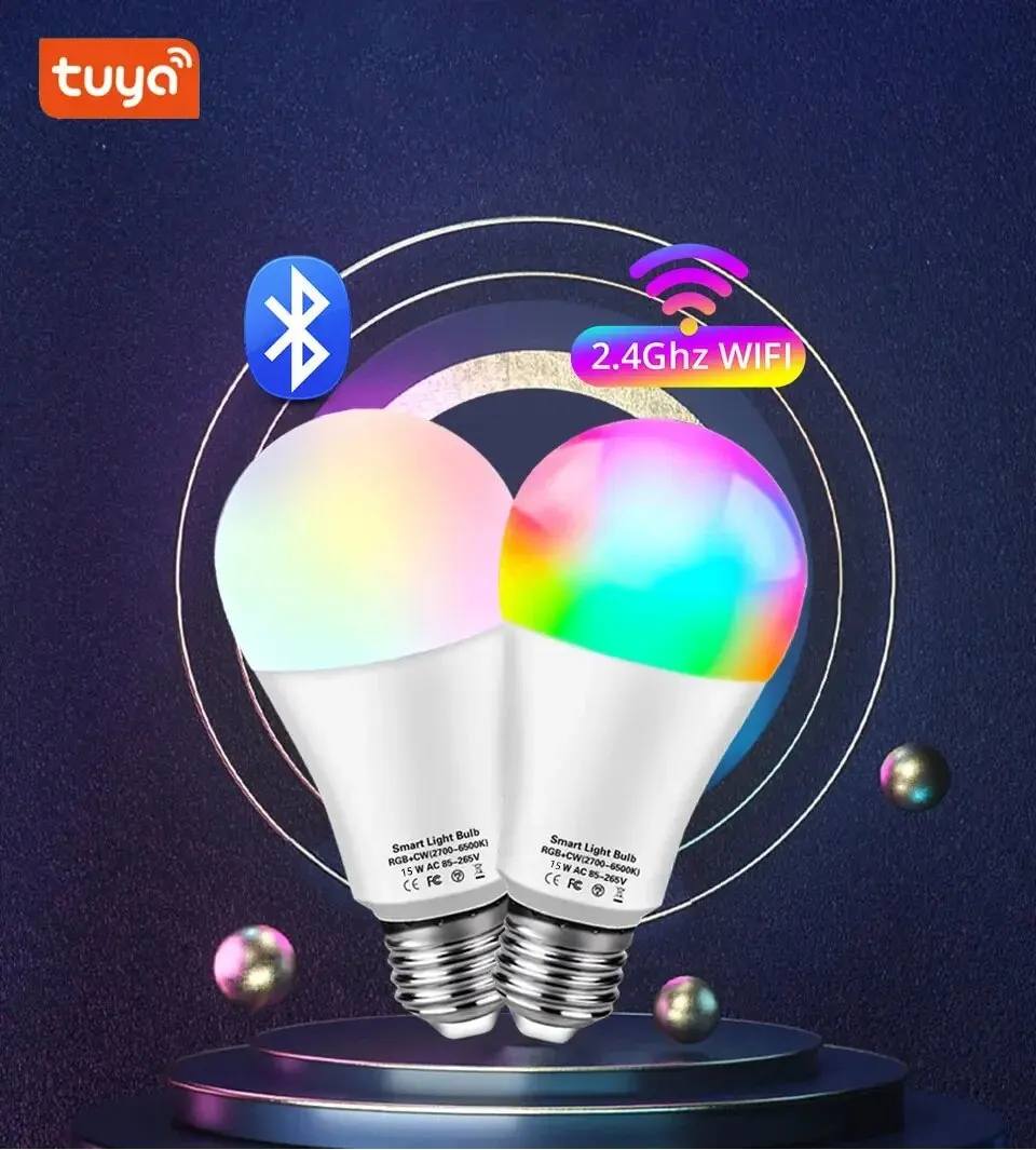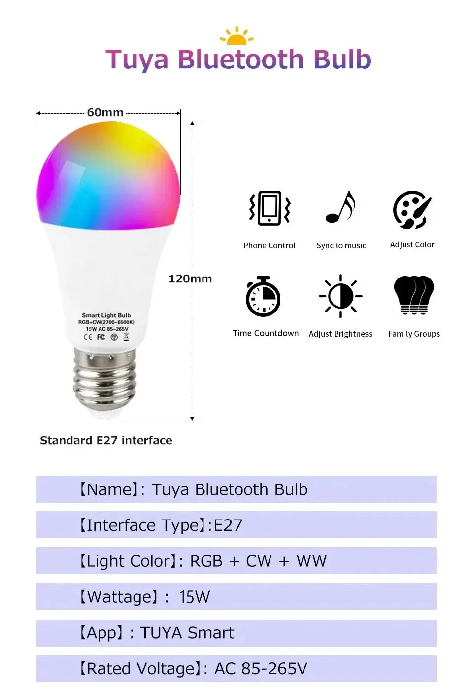 Tuya Bluetooth WiFi Smart Light Bulbs E27 LED Lamp RGB Smart Bulb 15W Smart Life APP Voice Control With Alexa Alice Google Home