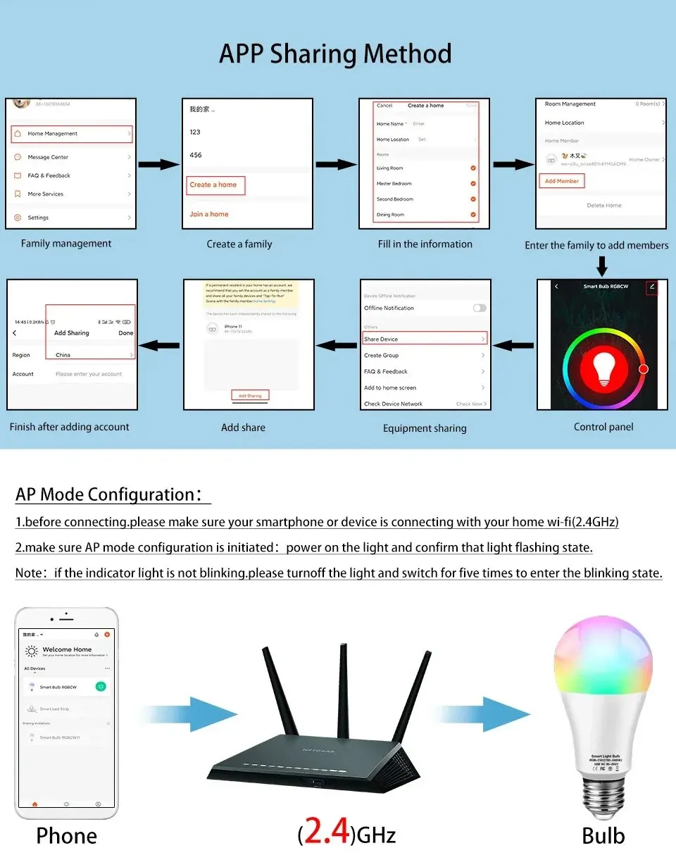 4. Open the APP --- Click "+" to add device--- Click "the light is flashing" ---- choose network contain '2.4G' instead '5G' ---- enter password and enter---Click "connect" --- select "TUYA smart" network--- click "next step" wait until full connected--- click the device "light" ---Click "my device" and select it.